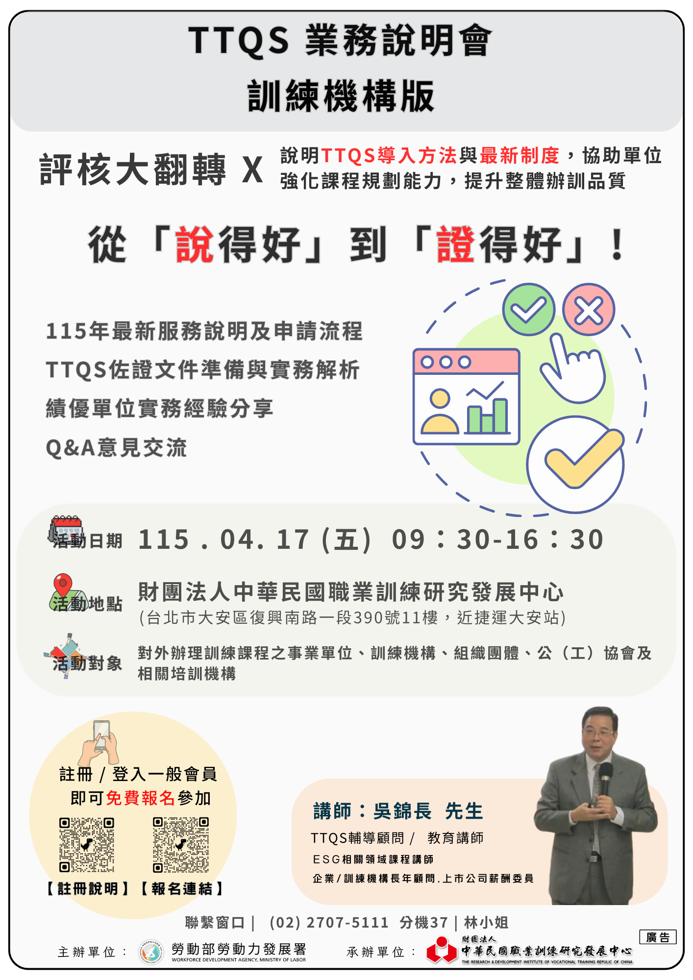 / 本活動將說明最新TTQS服務內容與申請流程,強調訓練課程規劃之有效性,協助訓練單位提升辦訓品質,強化培訓人員訓練管理職能 /