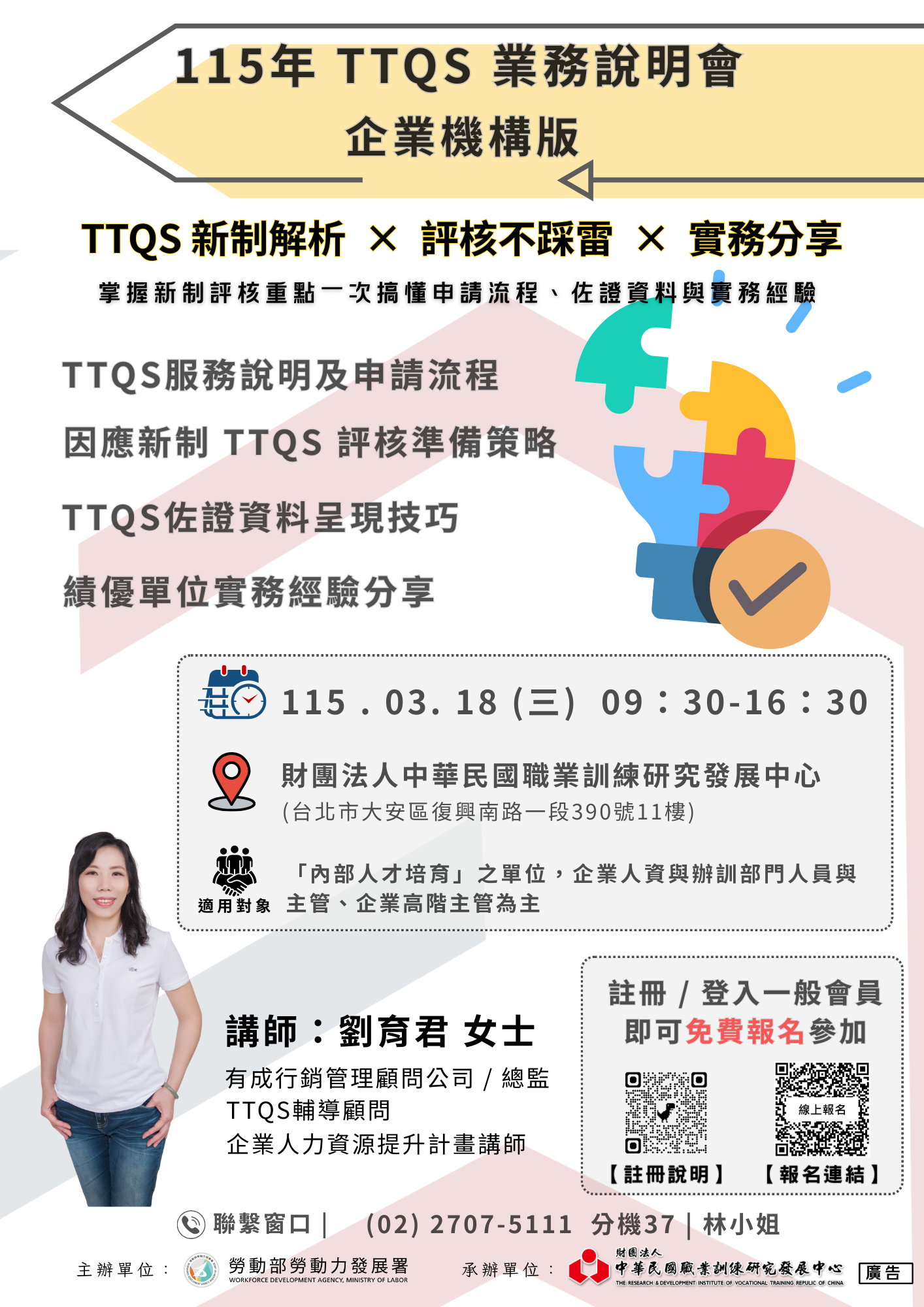 / 本活動將說明最新TTQS服務內容與申請流程,TTQS導入後之實際成效,強調課程訓練的有效性與管理機制,協助有意提升辦訓品質之單位,強化培訓人員的訓練管理職能,建立完善的人才發展制度 /